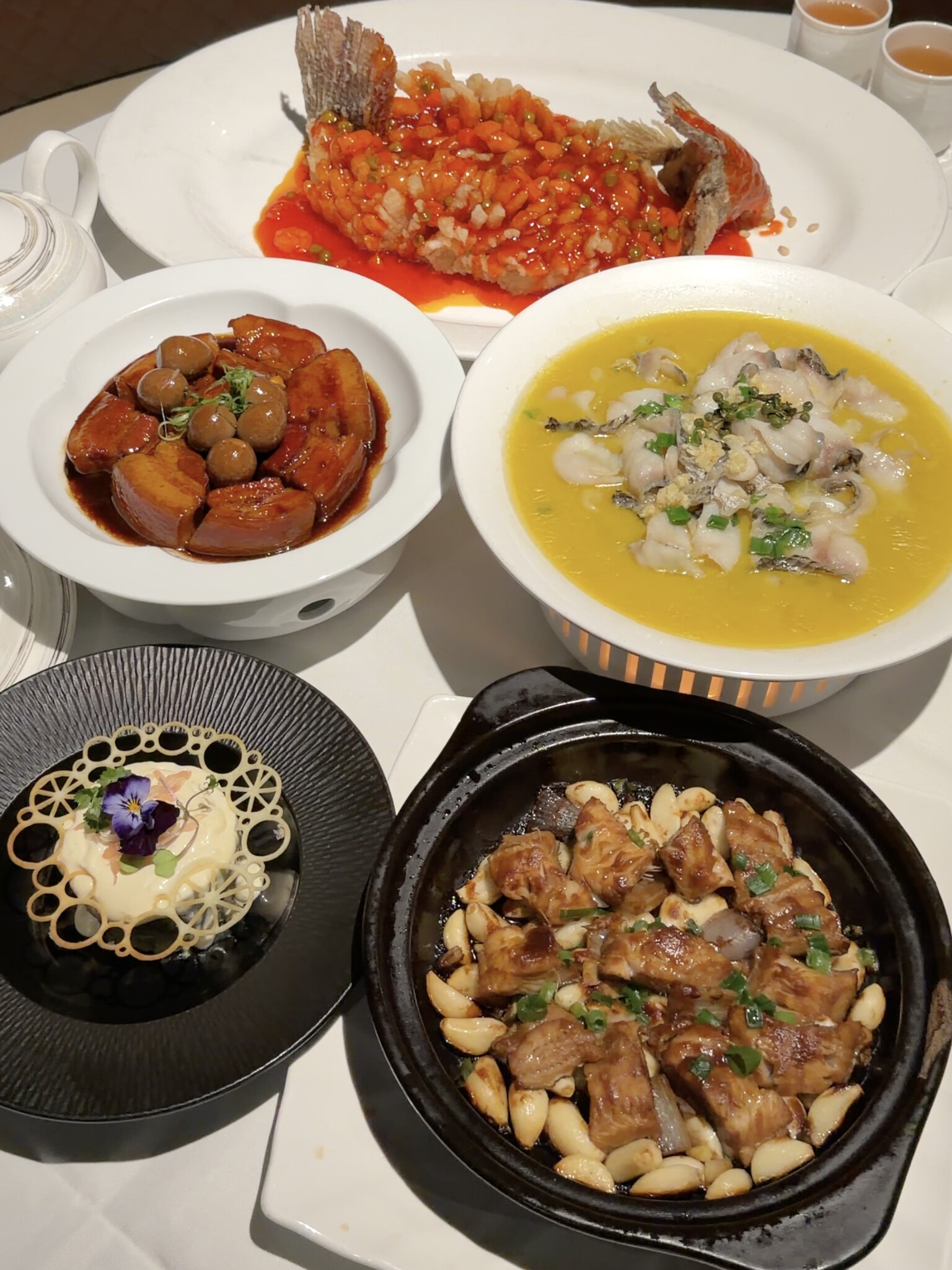 메뉴로는 시그니처 디시부터 수프, 핫 팟, 해산물, 누들 등 정말 다양했는데 우리는 그중 먹음직스러워 보이는 요리 몇 가지를 골라 즐겨보기로 했다. 주문한 메뉴로는 Sizzling Black Cod Clay Pot, Fish Slices with Pickled Mustard Green in Golden Sour Soup, Array 36 Signature Braised Pork, King Crab Meat Avocado Salad, Deep Fry Whole Fish in Sweet Sour Sauce까지 골라봤다