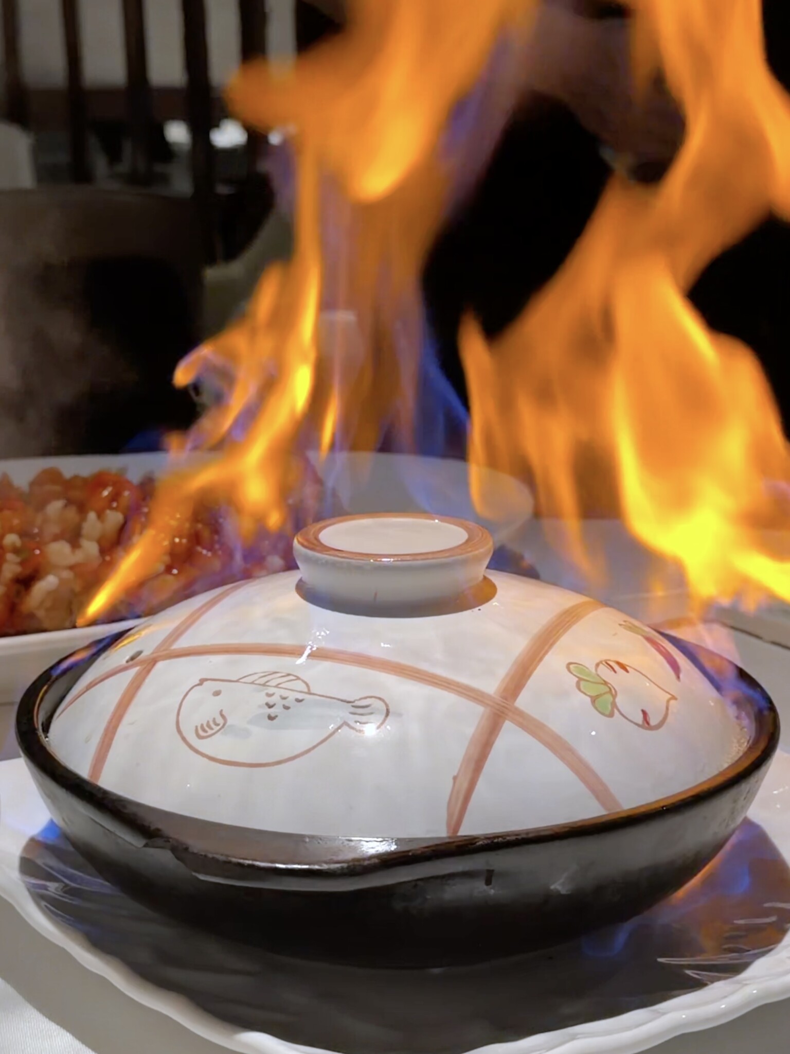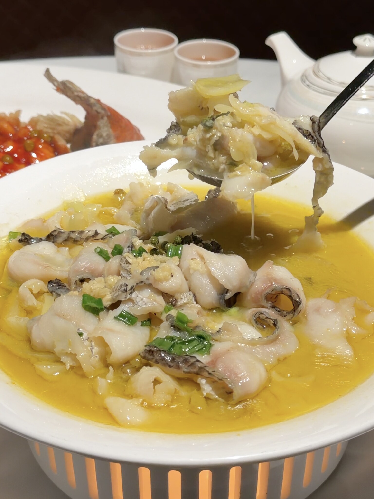 Sizzling Black Cod Clay Pot은 테이블에 서빙되는 순간부터 시선을 사로잡았다. 클레이팟 위로 술을 붓고 불을 붙이는 퍼포먼스가 이어지며 은은한 열기와 향이 퍼졌고, 자연스럽게 기대감을 높여주는 연출이었다. 불이 잦아든 뒤에는 클레이팟 안에 부드럽게 익은 블랙 코드가 촉촉한 질감을 유지하고 있었고, 간이 과하지 않아 생선 자체의 고소한 풍미가 깔끔하게 느껴졌다. 클레이팟 특유의 보온 덕분에 마지막까지 온도와 맛의 밸런스가 잘 유지되는 메뉴였다. Fish Slices with Pickled Mustard Green in Golden Sour Soup는 산뜻하면서도 깊은 국물 맛이 인상적인 메뉴였다. 처음 접해보는 조합이라 입맛에 맞을지 살짝 걱정했지만, 예상보다 산미가 강하지 않아 부담 없이 즐길 수 있었다. 절인 머스터드 그린의 산뜻한 산미가 국물에 자연스럽게 스며들어 느끼함 없이 깔끔하게 이어졌고, 생강 향이 은은하게 더해져 국물의 깊이를 살려주었다. 부드러운 생선 살과의 조합도 좋았으며, 전체적으로 자극적이지 않으면서 식사의 흐름을 정리해주는 역할을 해주는 수프였다.