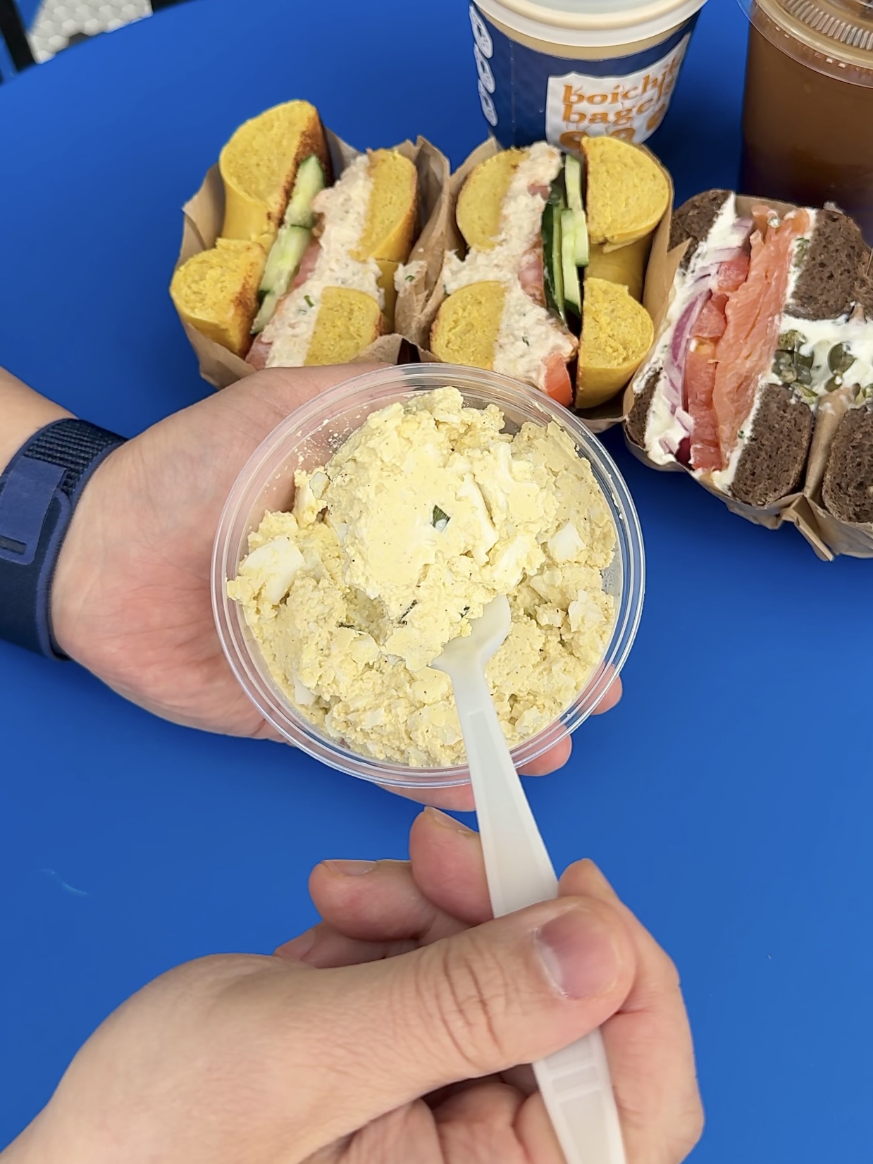The Classic의 Pumpernickel 베이글은 짭조름한 크림치즈와 연어 조합이 진한 풍미를 더해주는 메뉴로, 담백한 Pumpernickel 베이글은 살짝 쌉싸름한 맛이 있어 재료들과의 균형이 좋았고, 씹을수록 고소함이 더해졌으며 밀도가 높은 편이었다. 기본에 충실하면서도 질리지 않는 조합이라, 취향에 맞춰 베이글 종류를 바꿔가며 즐기는 것도 좋을 것 같다. The Mensch의 Egg 베이글은 담백한 맛이 중심을 잡아주는 구성으로, 화이트피쉬 샐러드 특유의 고소하고 짭조름한 풍미가 은은하게 퍼졌다. 부드러운 에그 베이글과의 조화도 좋아서 전체적으로 균형감 있는 맛이었고, 재료가 넉넉하게 들어 있어 한 입 한 입이 꽉 찬 느낌으로 만족스러웠다. Egg Salad는 크리미하면서도 간이 세지 않아 부담 없이 즐길 수 있었고, 촉촉하게 버무려진 에그가 입안에서 부드럽게 퍼졌다. 베이글 없이 단독으로 먹어도 충분히 만족스러울 만큼 완성도가 높았다.