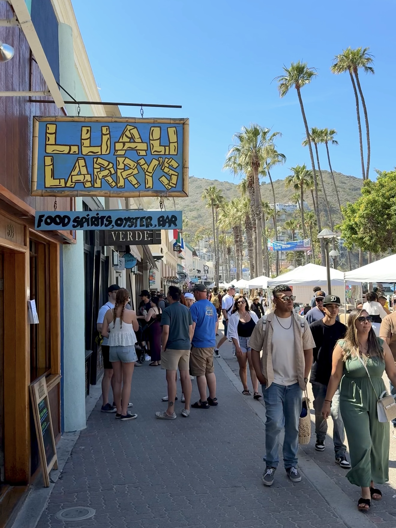 골프카트 투어를 마친 뒤에는 Avalon의 주요 해안가 거리인 Crescent Avenue, 흔히 Front Street라고 불리는 곳을 천천히 걸어보기로 했다. 이 거리는 자동차 없이 보행자 중심으로 조성되어 있어, 섬 특유의 평온하고 여유로운 분위기를 그대로 느낄 수 있는 곳이다. 거리 양쪽으로는 아기자기한 기념품 가게와 해산물 레스토랑, 카페들이 줄지어 있고, 그 사이사이에 오래된 건물과 벤치, 야자수들이 어우러져 있어 걷기만 해도 기분이 좋아졌다.