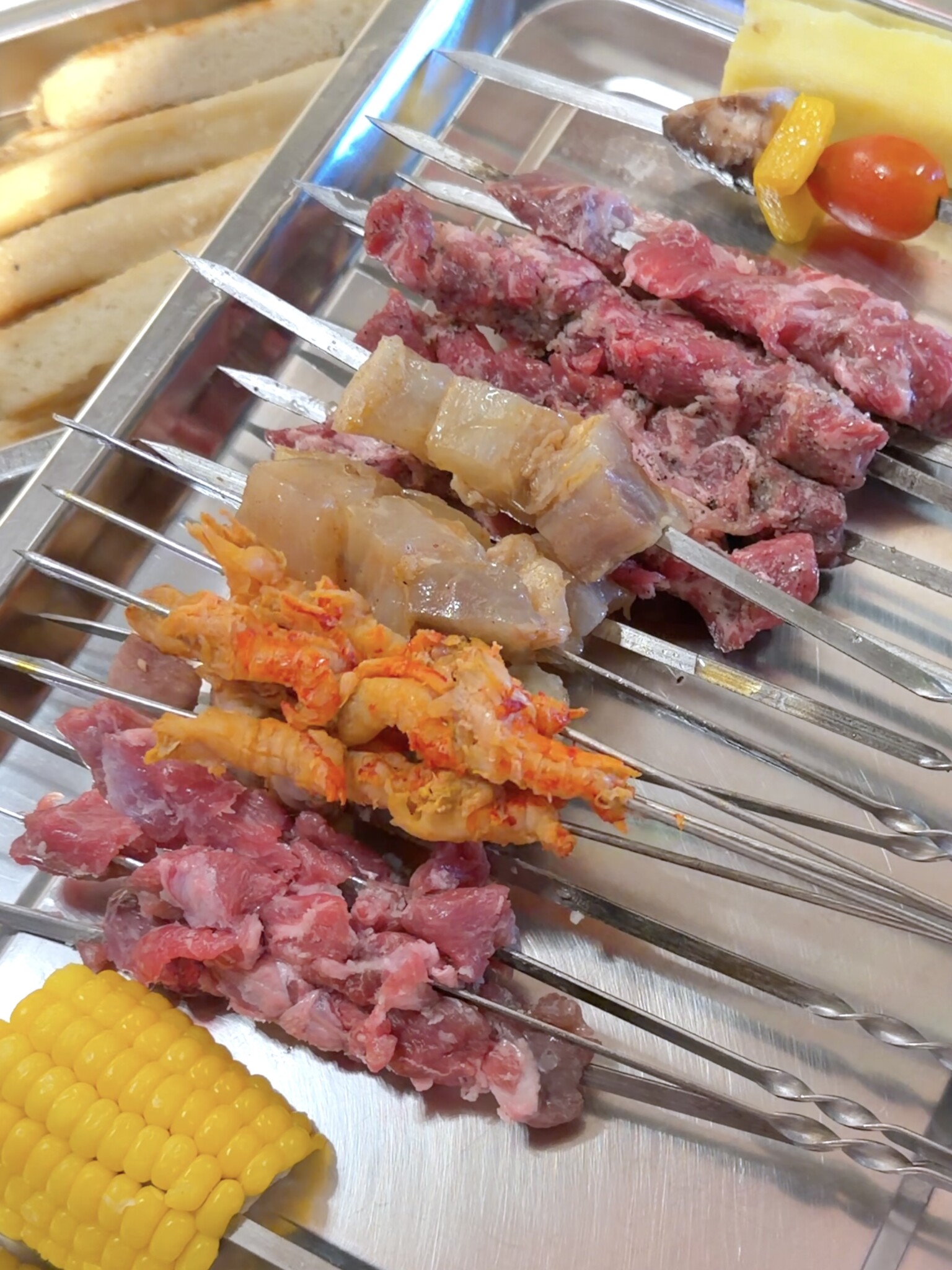 이곳은 셀프바에서 원하는 재료를 직접 가져와 구워 먹는 방식으로 운영된다. A5 Lean Wagyu와 A5 Black Pepper Wagyu를 비롯해 Cooked Tendon, Beef Intestines, Crawfish, Lamb, Sweet Corn, Mixed Veggies, Pineapple 등 다양한 재료를 취향에 맞게 선택할 수 있었고, 고기부터 해산물, 채소까지 폭넓게 구성되어 있어 조합을 바꿔가며 즐기는 재미가 있었다. 재료 하나하나를 직접 고르고 굽는 과정이 자연스럽게 식사의 일부처럼 이어지며, 선택하는 단계부터 경험이 시작되는 느낌이었다.