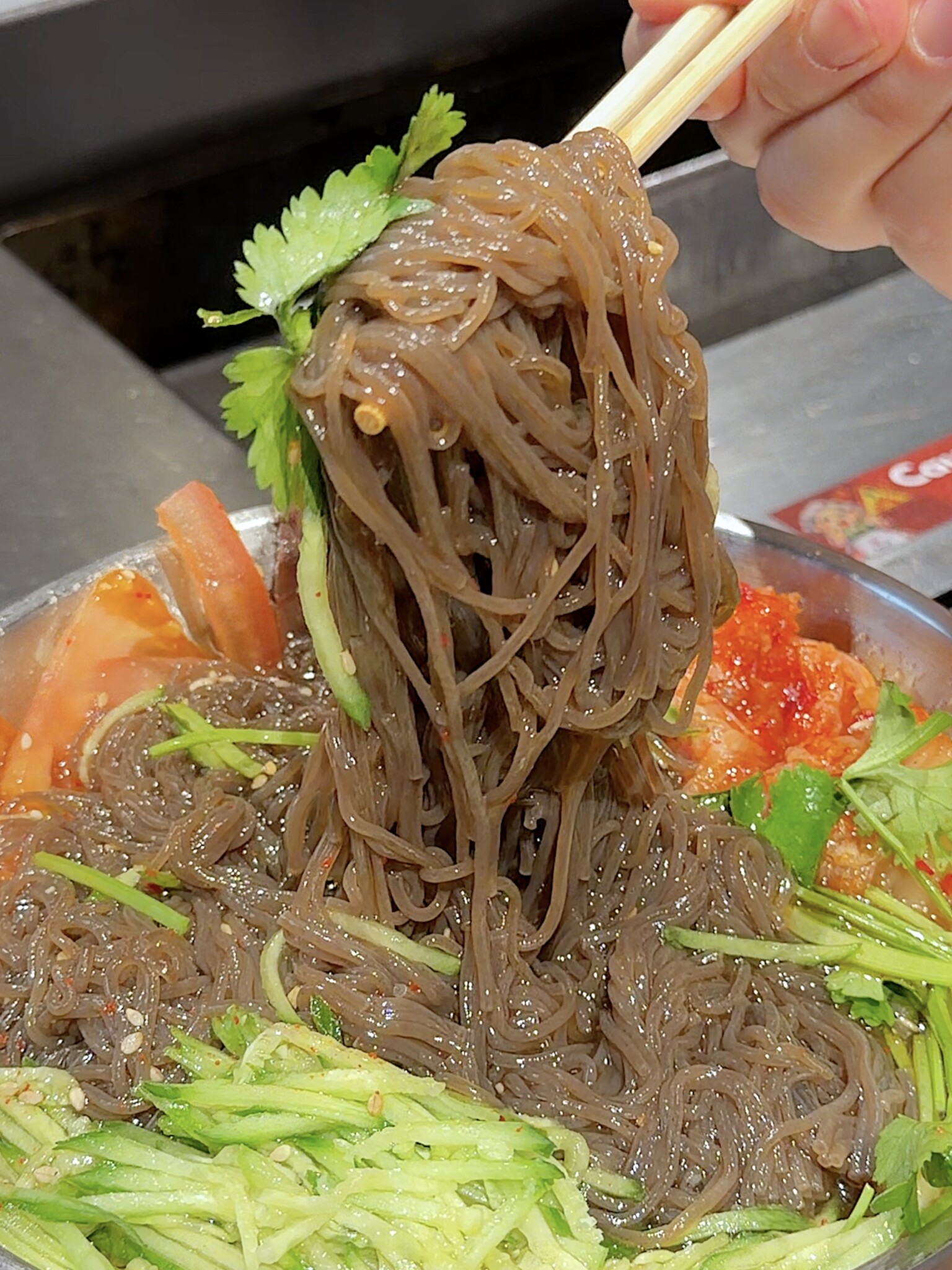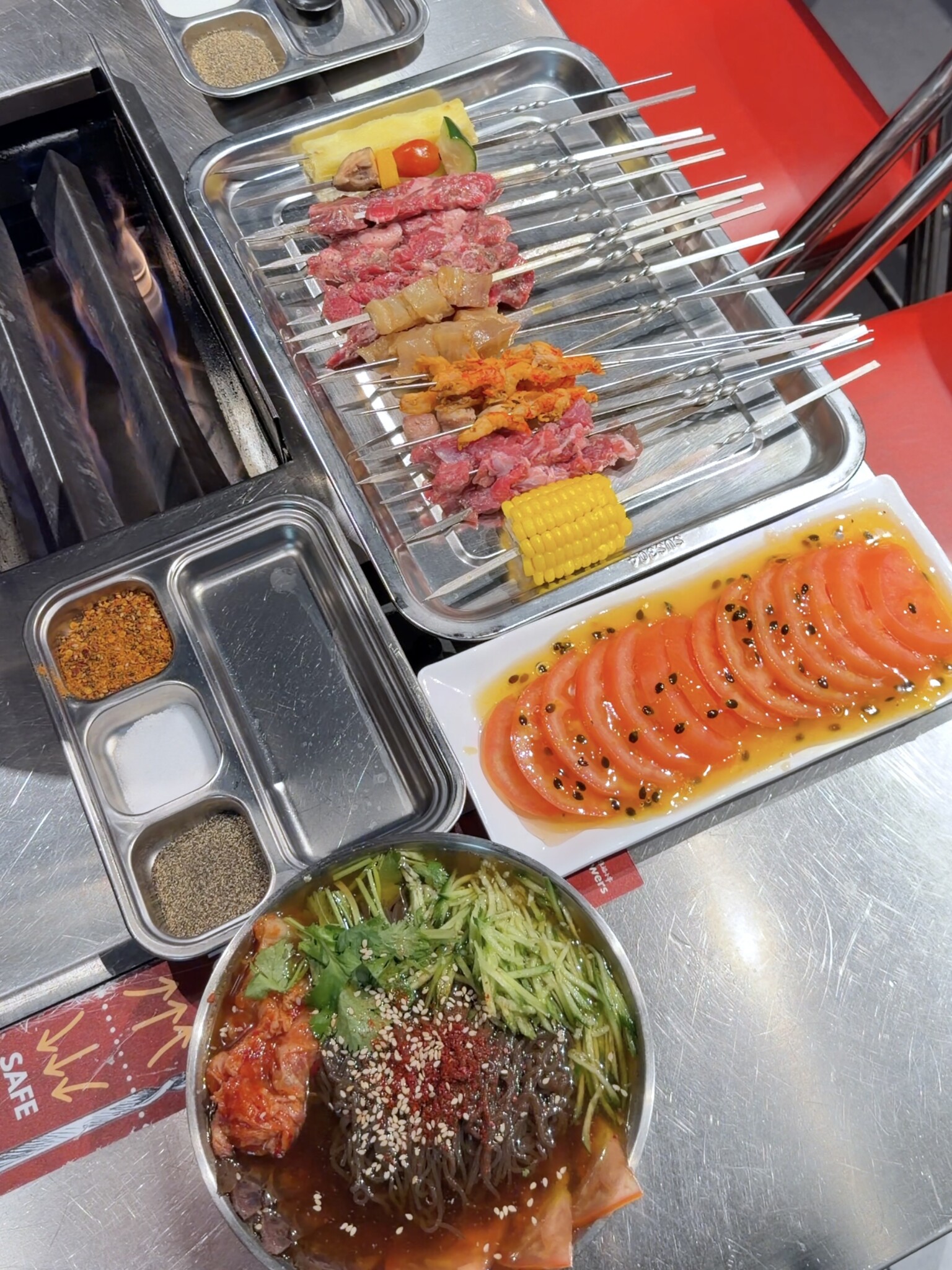 직접 고른 재료들은 불 위에서 바로 구워 먹는 방식이라, 재료마다 다른 식감과 풍미를 비교해보는 재미도 있었다. A5 Wagyu는 부드럽고 고소한 맛이 중심이 되었고, 양고기와 내장류는 좀 더 또렷한 풍미로 대비를 더해줬다. Crawfish는 해산물 특유의 담백함이 살아 있었고, Sweet Corn과 채소류는 중간중간 입맛을 정리해주며 전체적인 흐름을 균형 있게 이어줬다. 다양한 재료를 번갈아 먹다 보니 식사가 지루할 틈 없이 자연스럽게 이어졌다. 사이드 메뉴는 QR 코드를 통해 따로 주문할 수 있었는데, Tomato Slices with Passion Fruits Honey는 상큼한 산미와 은은한 단맛이 더해져 고기 메뉴 사이에서 가볍게 즐기기 좋았고, Northeastern Style Cold Noodles는 시원하면서도 담백한 맛으로 구이 메뉴 사이에서 균형을 잡아주는 역할을 했다. 메인 메뉴와 대비되는 가벼운 구성으로 식사의 흐름을 한층 더 정리해주는 느낌이었다.