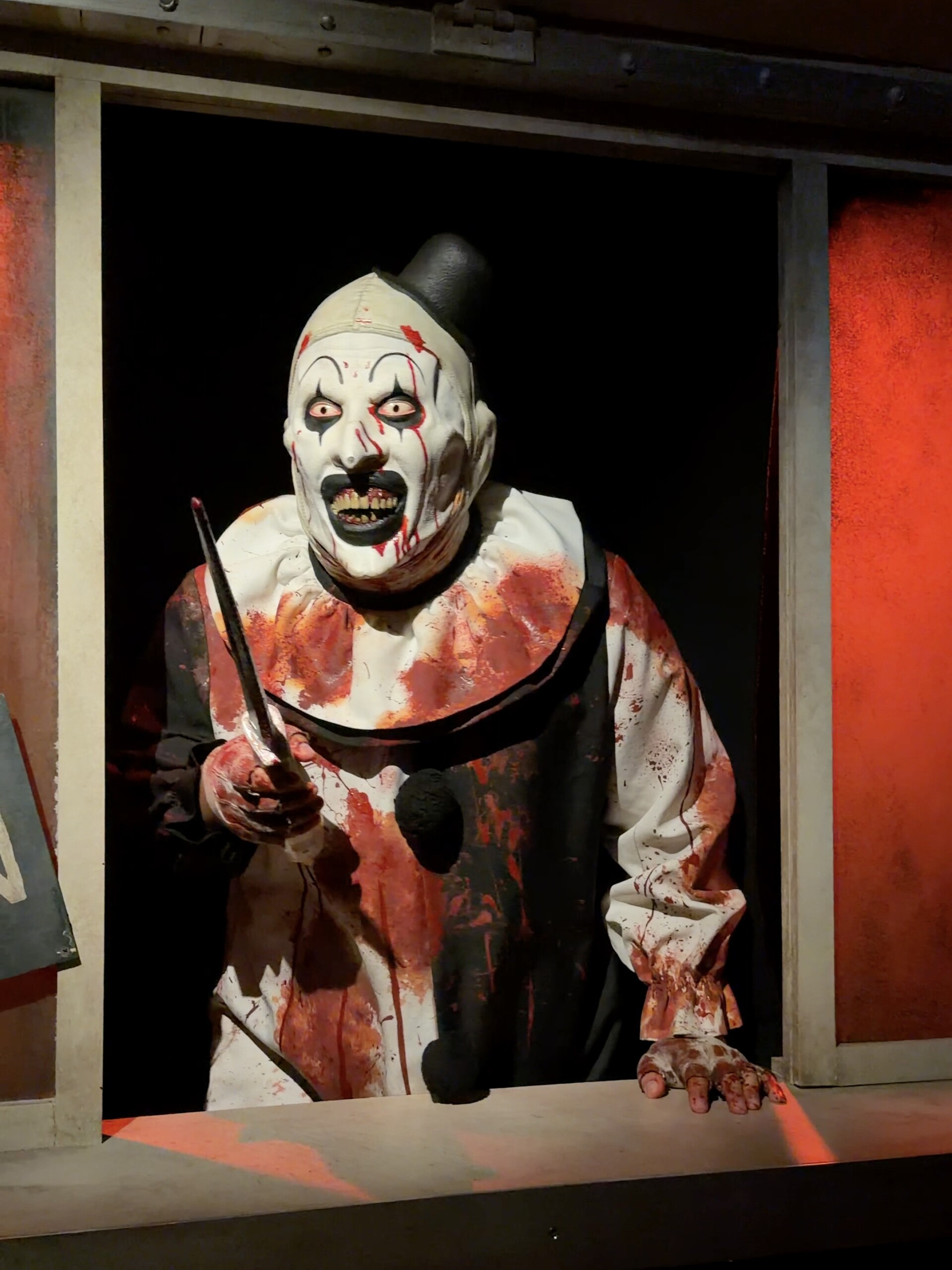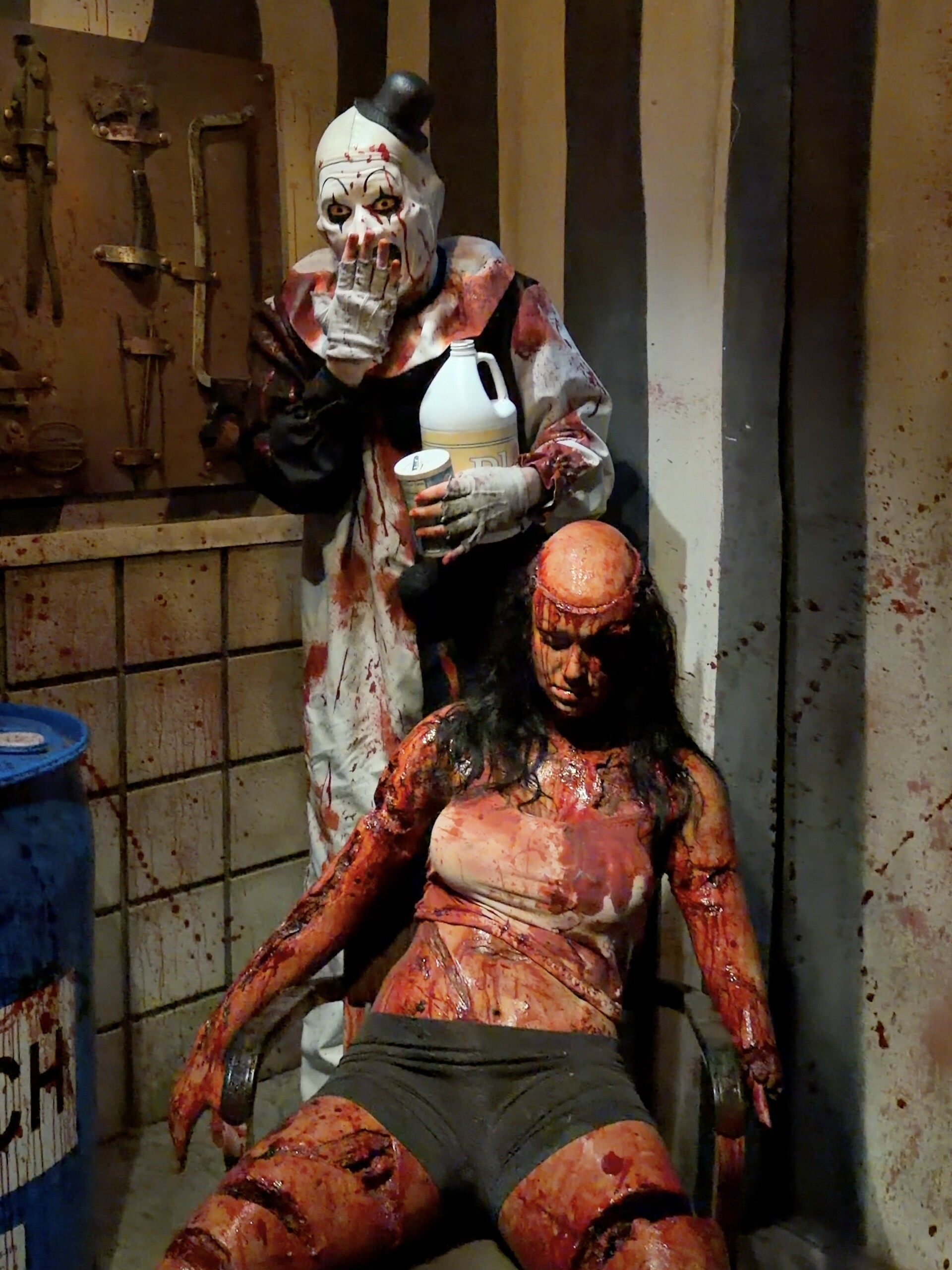 이번 방문에서는 Halloween Horror Nights만의 긴장감 넘치는 분위기를 제대로 느낄 수 있었다. 특히 올해는 Fallout, Five Nights at Freddy’s, Terrifier 같은 새로운 테마가 Haunted House에 추가되어 더욱 풍성한 경험을 선사했다. 인기 영화와 게임을 테마로 꾸며진 공간들은 디테일이 살아 있어, 마치 작품 속에 들어간 듯한 몰입감을 주었다. 미로 같은 공간을 따라 걸을 때마다 예측할 수 없는 순간에 등장하는 배우들이 긴장을 놓지 못하게 만들었고, 곳곳에 숨겨진 연출 덕분에 보는 재미와 놀라는 재미가 동시에 있었다. Scare Zone 또한 인상 깊었다. 공원 곳곳을 자유롭게 돌아다니는 삐에로와 까마귀, 괴물 캐릭터들이 갑자기 다가오거나 소리를 지르며 분위기를 한층 고조시켰는데, 단순히 걷는 것만으로도 스릴이 느껴졌다. 공포감과 긴장감 속에서도 웃음이 터져 나오는 순간들이 있어, 함께 간 사람들과 오래 기억에 남을 경험이 되었다.