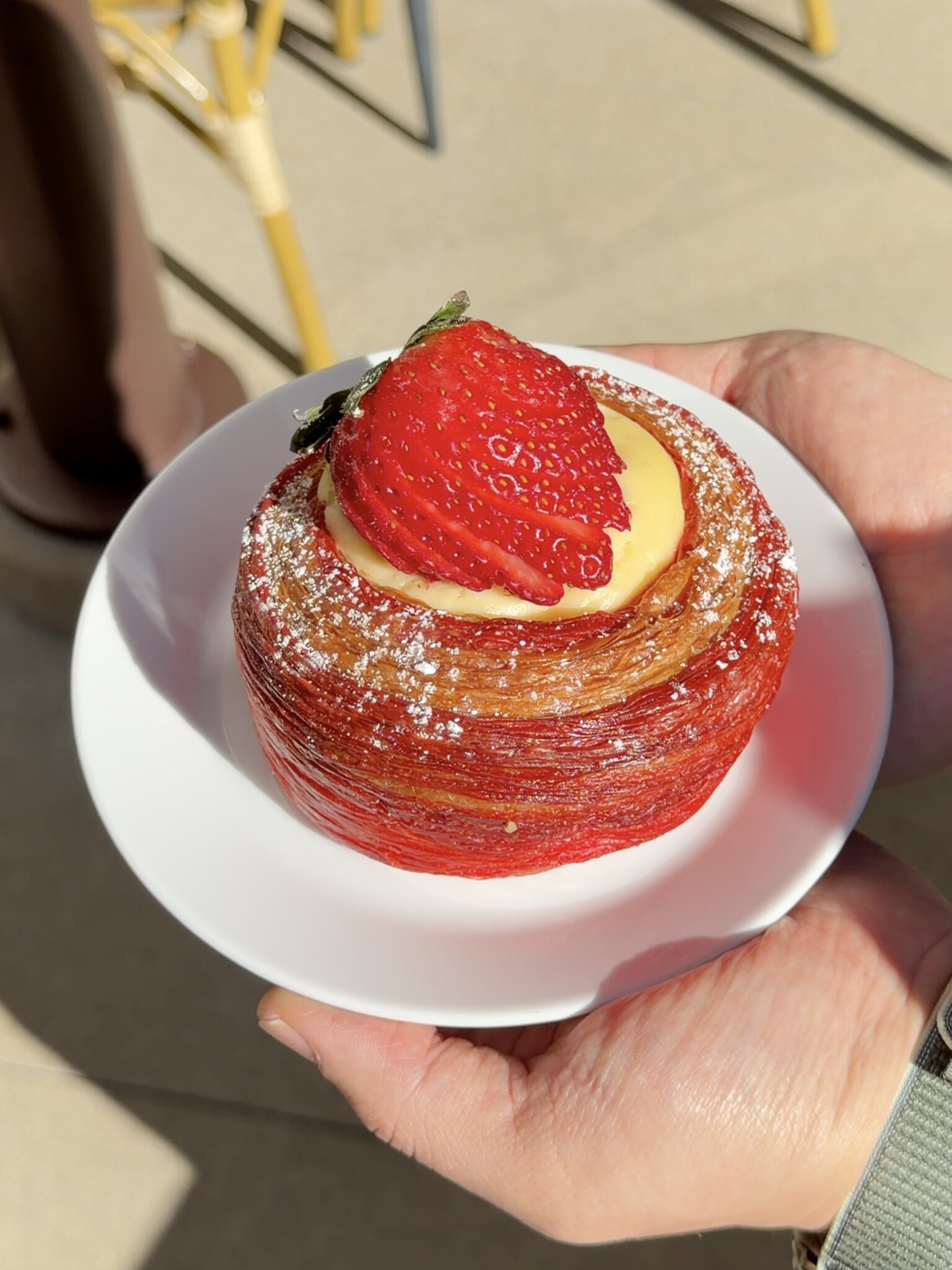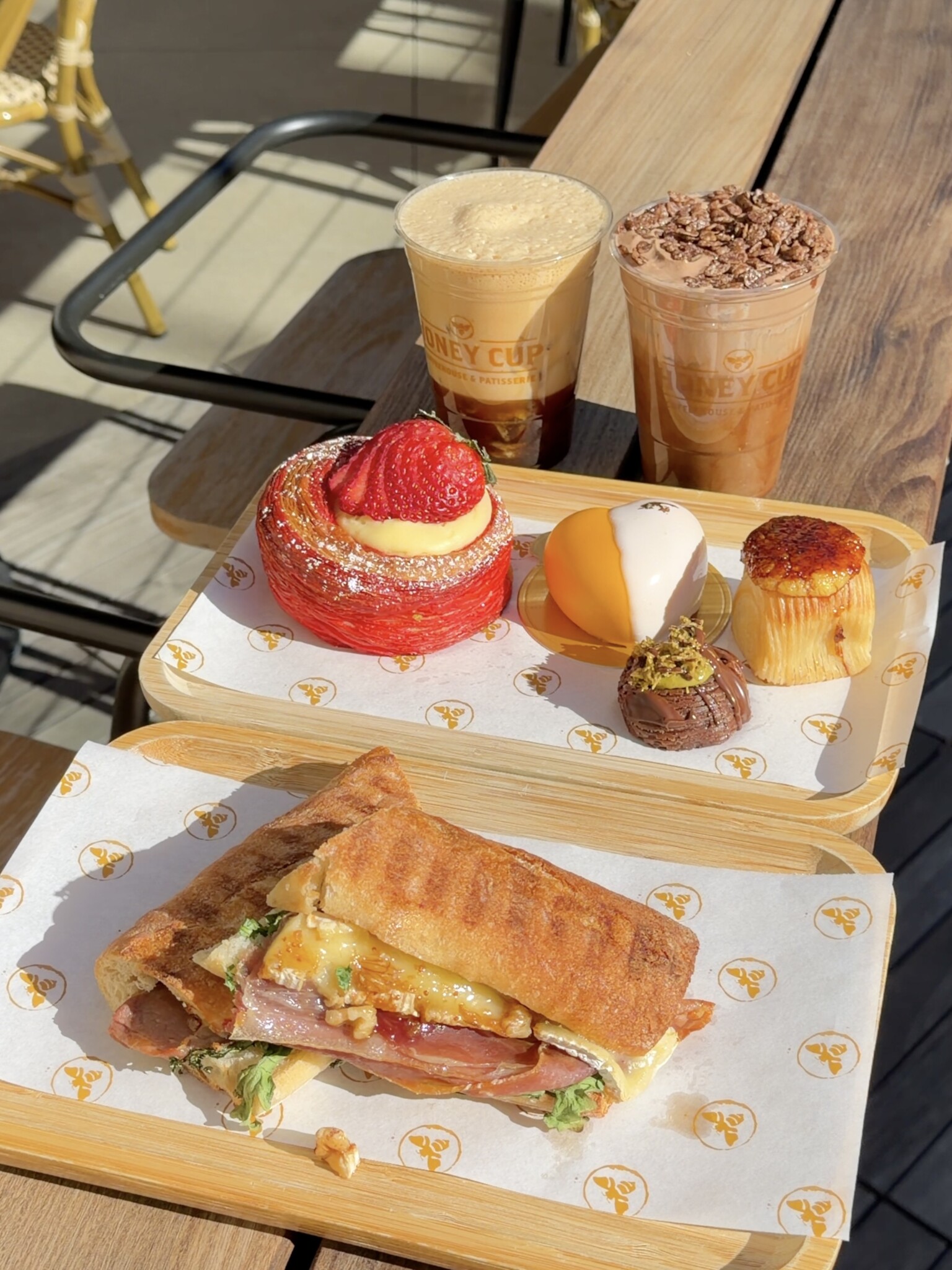 이곳에서는 다양한 종류의 디저트와 커피, 간단한 식사와 아이스크림까지 함께 즐길 수 있는데, 그중 Strawberry Croissant, Mini Crème Brulee, Mini Dubai Croissant, Baguette Prosciutto & Brie와 함께 Iced Coco Pebbels Latte, Double Freddo Espresso, Amadee를 주문해봤다. Strawberry Croissant는 겉은 바삭하고 안쪽은 부드러웠으며, 상큼한 딸기와 크림이 자연스럽게 어우러졌다. Mini Crème Brulee는 상단의 설탕이 얇게 캐러멜라이즈되어 있어 깨는 순간의 식감이 인상적이었다. Mini Dubai Croissant는 바삭한 결 사이로 진한 두바이 초콜릿이 채워져 있어 비교적 깊은 단맛을 느낄 수 있었다.