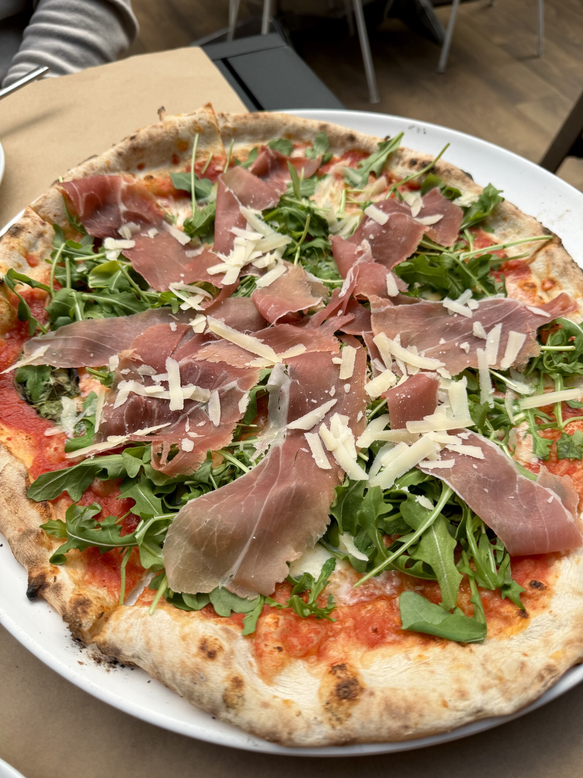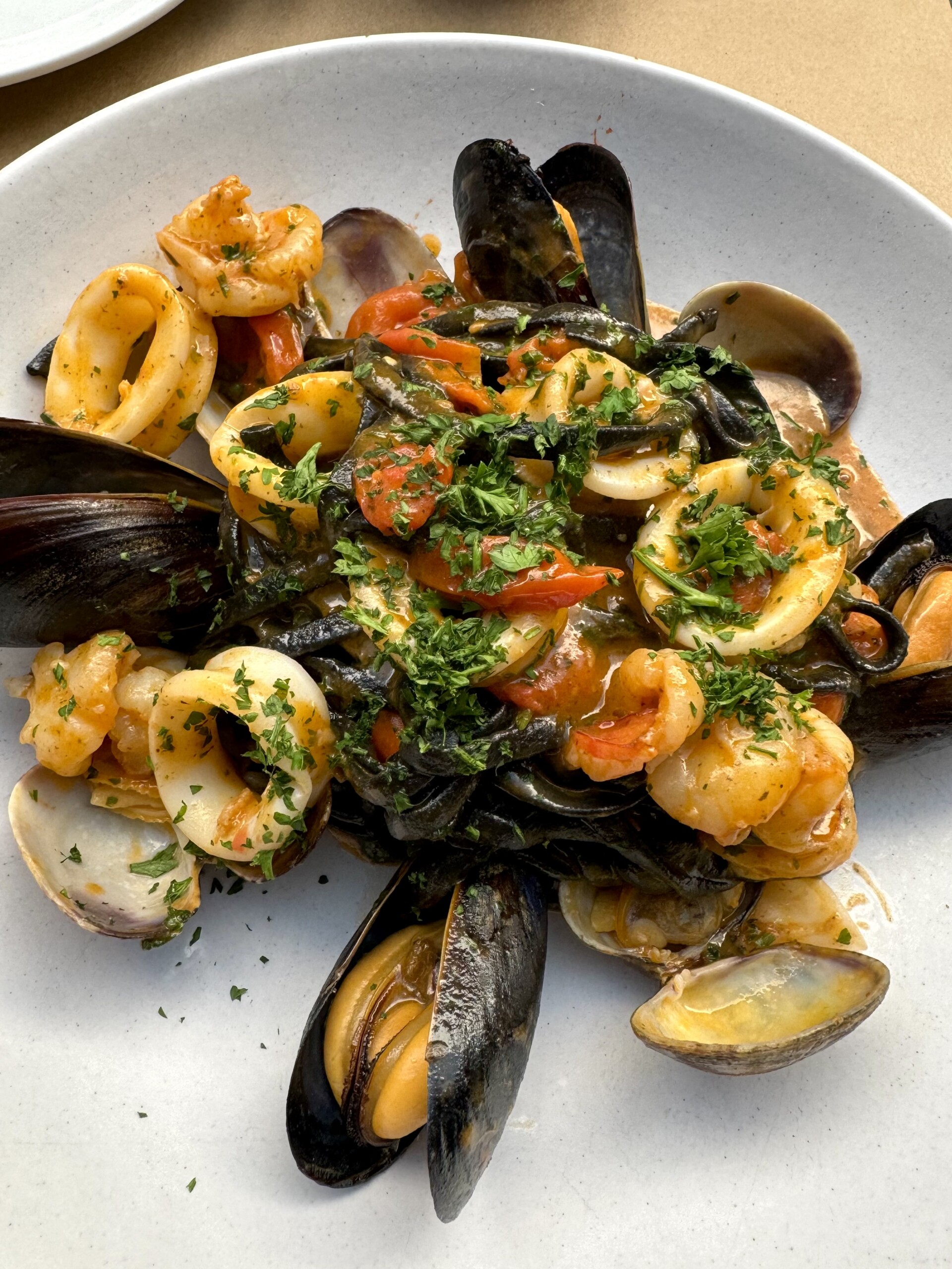 가장 먼저 나온 Arancini는 겉은 바삭하고 속은 부드러운 식감으로, 치즈와 토마토 소스가 어우러져 예상보다 훨씬 풍성한 맛을 냈다. 무겁게 느껴질 줄 알았는데, 의외로 균형이 잘 잡혀 있어 부담 없이 즐기기 좋았다. 다음으로 나온 Linguine Pescatora는 먹물 링귀니 면에 해산물이 듬뿍 들어간 메뉴였다. 향부터 해산물 풍미가 진하게 퍼졌고, 오징어, 조개, 홍합 모두 신선했다. 특히 면이 소스를 잘 머금고 있어 마지막 한입까지 맛이 또렷하게 살아 있었다. 마지막으로 나온 Margherita 피자는 클래식한 조합이지만, 치즈의 고소함과 토마토 소스의 산미가 잘 어우러져 밸런스가 좋았다. 우리는 여기에 프로슈토를 추가했는데, 짭조름한 햄이 더해지면서 맛이 한층 깊어졌다. 다만 개인적으로는 피자 도우가 살짝 짜게 느껴져서, 그 부분이 조금만 덜했더라면 더 좋았을 것 같다. 피자 크기가 꽤 크고 양도 넉넉한 편이라 주문 시 참고하면 좋을 듯하다.