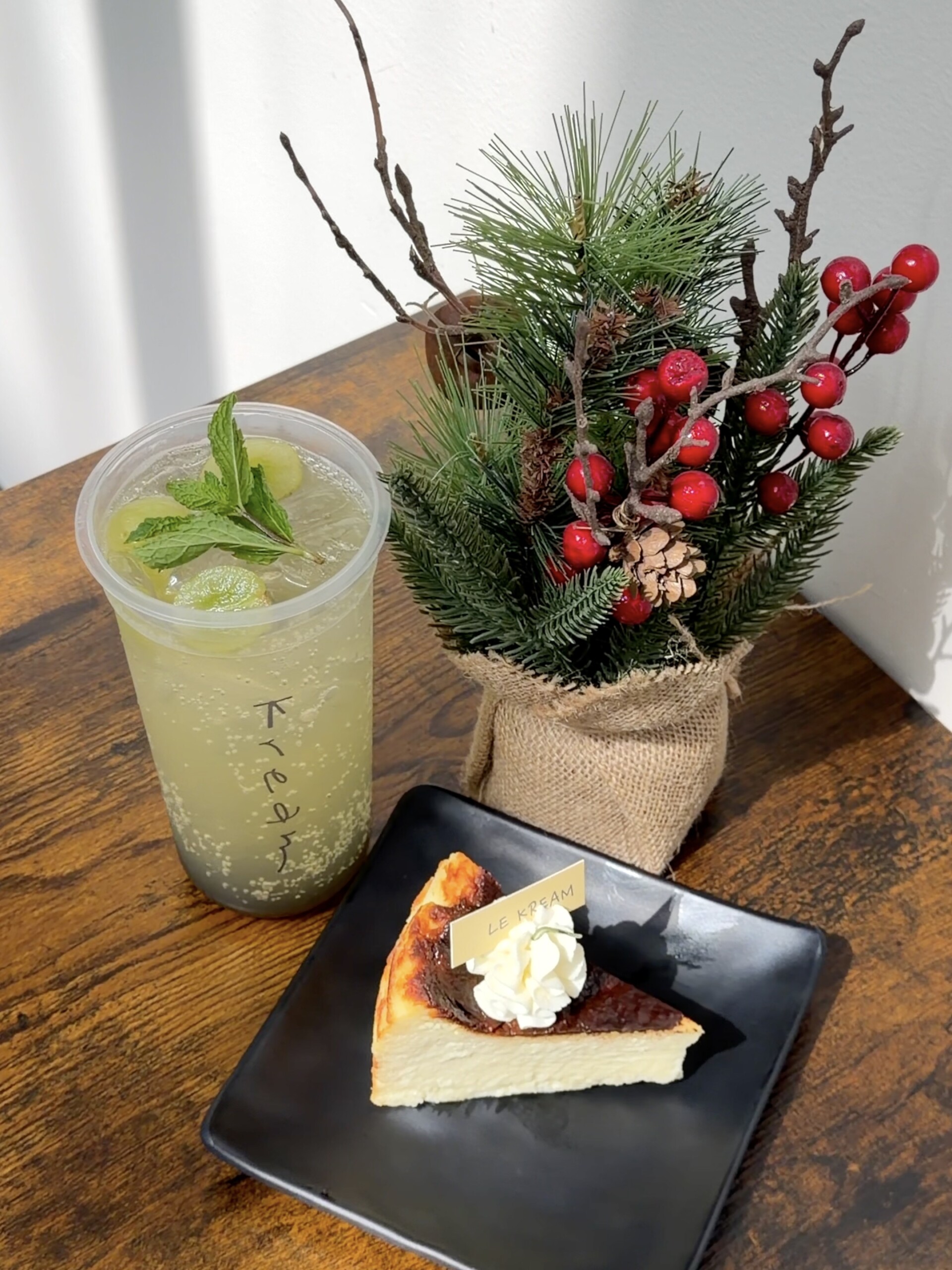 Sweet Corn Kream Spanner는 달콤하고 고소한 옥수수 풍미가 크림과 어우러져 독특하면서도 친숙한 맛을 보여줬다. 은은한 단맛이 부드럽게 이어지며, 고소한 옥수수의 뒷맛이 남아 마치 디저트를 마시는 듯한 재미가 있었다. 특색 있는 음료를 찾는다면 좋은 선택이었다. Green Grape Ade는 네 가지 음료 중 가장 산뜻하고 가볍게 즐길 수 있는 메뉴였다. 청포도의 상큼하고 시원한 맛이 입안을 깨끗하게 정리해 주었고, 크루아상의 버터리한 맛이나 크림이 풍부한 음료들과도 잘 어울렸다. 특히 사장님이 직접 인기 있는 메뉴라고 소개해주신 만큼, 한 모금 마시자마자 그 이유를 알 수 있었다. 달콤하면서도 청량한 마무리 덕분에 전체적으로 균형을 잡아주는 역할을 하며, 누구나 부담 없이 즐기기 좋은 음료였다. 마지막으로 Basque Cheese Cake는 겉은 살짝 그을려진 듯 구워져 진한 치즈 향이 풍기고, 속은 촉촉하면서도 부드러운 질감이 매력적인 치즈케이크였다. 한 입 베어 물면 치즈 특유의 진하고 크리미한 맛이 퍼지면서 은은한 단맛이 뒤따라, 무겁지 않으면서도 깊이 있는 풍미를 즐길 수 있었다. 큐브 크루아상이나 크림 가득한 음료와 함께 곁들이니 맛의 균형이 잘 맞아, 전체적인 디저트 타임을 한층 풍성하게 만들어주었다.