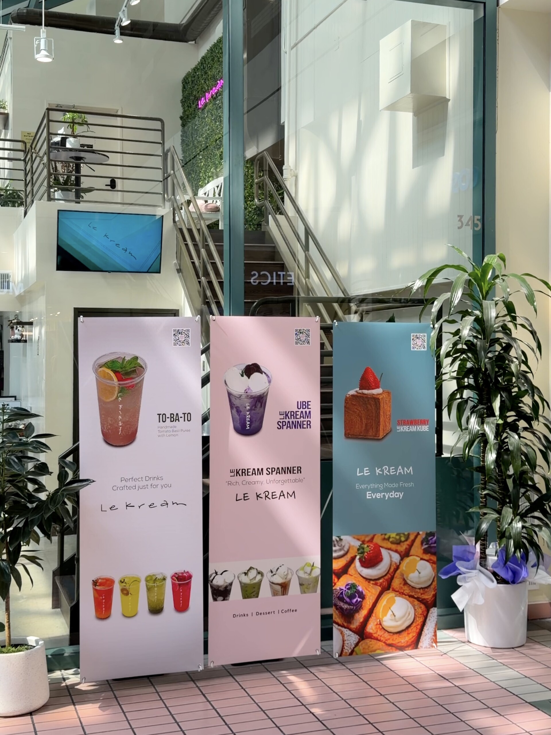 Ktown Plaza 3층에 위치한 Le Kream은 다양한 음료와 함께 즐길 수 있는 네모난 큐브 모양의 크루아상이 시그니처로, 독특한 비주얼과 다채로운 맛 덕분에 디저트 타임이 한층 풍성해지는 곳이다. 매장은 1층에서 주문하고 2층에서 머물 수 있는 구조로 되어 있으며, 2층 공간은 여유롭게 꾸며져 있어 편안하게 앉아 즐기기에 좋다. 또한 매장 외부에도 좌석이 넉넉히 마련되어 있어 탁 트인 공간에서 디저트를 즐기기에 제격이다.
