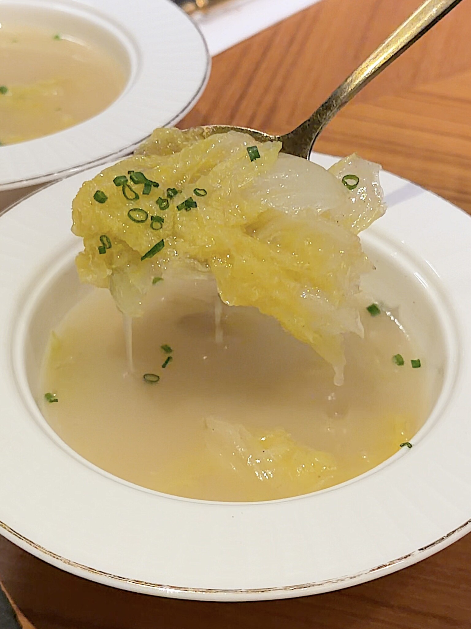먼저 메인으로 맛본 Wagyu Steak Frites는 주문한 미디움 굽기로 잘 조리되어 육즙이 풍부했고, 고기의 고소한 풍미가 깔끔하게 이어졌다. 함께 나온 감자튀김도 과하게 기름지지 않아 스테이크와 자연스럽게 어우러졌다. 여기에 뷔페 메뉴에 새롭게 추가된 Peking duck을 같이 맛보았는데, 바삭하게 구워진 오리 껍질과 부드러운 속살의 대비가 인상적이었다. 오리 고기를 팬케이크에 소스와 야채를 곁들여 싸 먹으면 풍미와 식감이 더해져 또 다른 방식으로 즐길 수 있었고, 전체적으로 완성도가 높게 느껴졌다. 또한 Duck Bone Soup은 진하게 우러난 국물로 식사 중간 입맛을 편안하게 정리해주었다.