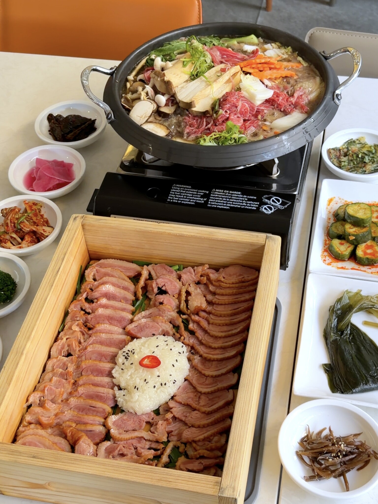 이곳은 편백 나무를 활용한 Steamed Cypress Wood Platters를 중심으로 한 메뉴 구성이 특징이다. 이번 방문에서는 편백 훈제 오리찜과 육수 불고기를 주문해봤다. 편백 훈제 오리찜은 오리 아래에 부추가 함께 깔려 나와 전체적인 풍미를 자연스럽게 받쳐주었고, 기름지지 않고 담백하게 정리된 맛이 인상적이었다. 찜 방식으로 조리되어 재료의 수분감이 잘 유지되어 있었고, 부드럽게 이어지는 식감이 중심이 되었다. 함께 제공된 머스타드 소스와 매콤한 소스는 취향에 따라 곁들일 수 있어, 같은 메뉴도 다른 느낌으로 즐길 수 있었다.