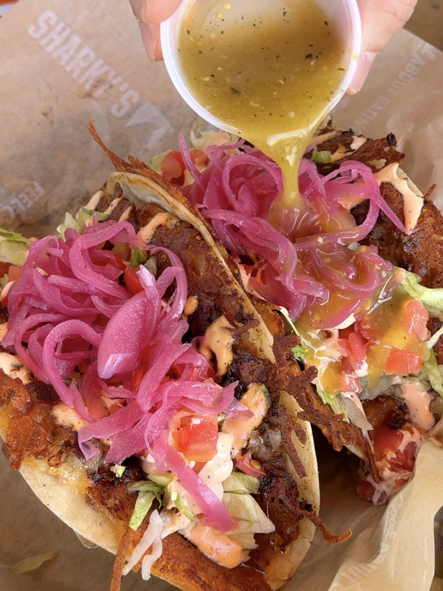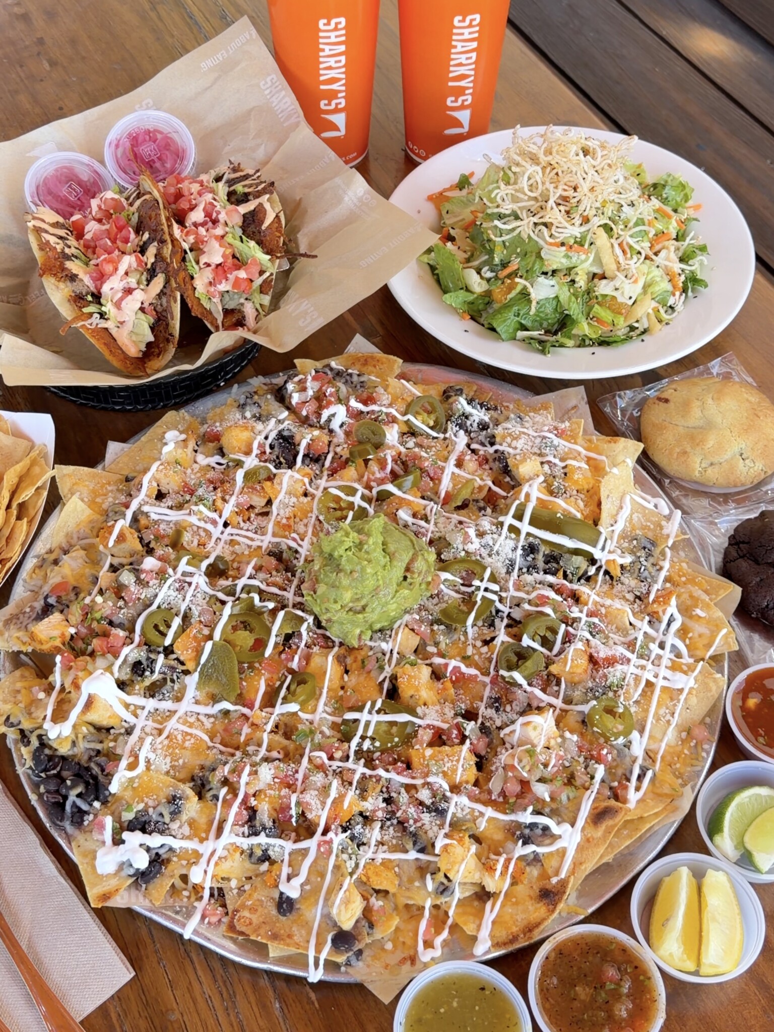 이번 방문에서는 Wagyu Smashburger Taco, Nachos Grande, Sharky’s Chicken Salad, 그리고 디저트로 OMFG Cookie와 The Double Double Cookie를 주문해봤다. Wagyu Smashburger Taco는 이름 그대로 햄버거와 타코가 합쳐진 듯한 느낌의 메뉴로, 고기의 풍미와 부드러운 식감이 중심이 되었다. 전체적으로 익숙한 버거의 느낌을 가지고 있으면서도 또르티야와 함께 가볍게 풀어낸 구성이 인상적이었고, 부담 없이 즐기기 좋은 균형을 보여줬다. 매장 내에는 소스바가 따로 마련되어 있어 취향에 따라 다양한 소스를 직접 가져다 먹을 수 있었고, 타코에 곁들여 먹으니 메뉴에 따라 원하는 조합으로 맛을 조절할 수 있다는 점도 인상적이었다.