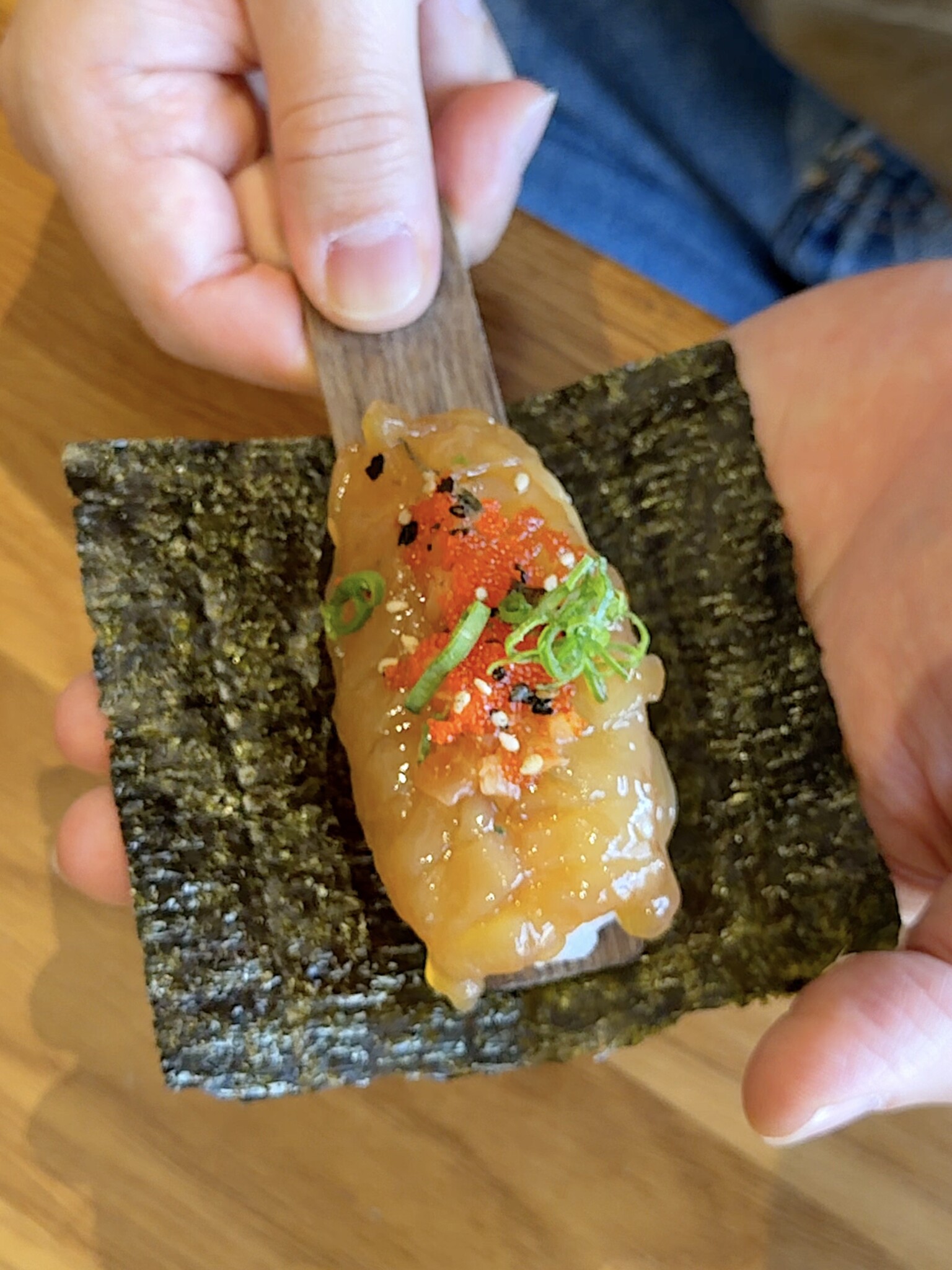 Sonmari는 따로 제공된 김 위에 Temaki Stick을 올려 손으로 잡고, 막대를 빼내며 형태를 완성해 먹는 방식이 인상적이었다. 한입에 먹기 좋게 정리된 구성이라 부담 없이 즐길 수 있었고, 재료마다 다른 풍미가 또렷하게 느껴졌다. Salmon Yellowtail은 비교적 담백하고 부드러운 식감이 중심이 되었고, Blue Crab은 고소한 맛이 더해져 전체적인 균형을 잡아주었다. Saewoo-Jang은 은은한 간장 베이스의 감칠맛이 살아 있어 마무리까지 자연스럽게 이어졌다. 밥과 재료의 비율도 안정적으로 맞춰져 있어 여러 가지를 번갈아 먹어도 지루함 없이 즐길 수 있었다.