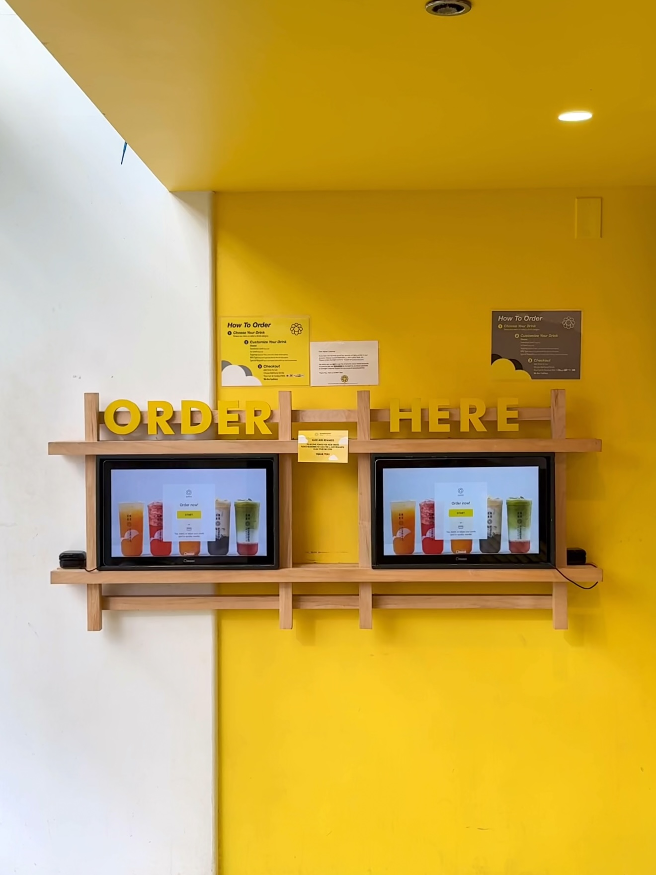이곳은 셀프 서비스 키오스크로 주문할 수 있으며, 각 메뉴를 사진으로 직접 확인할 수 있어 선택이 더욱 편리했다. 우리는 여러 종류의 음료 중 Brown Sugar Boba Milk와 Brulee Oat Latte – Matcha, Mango Yakult를 주문해봤다.